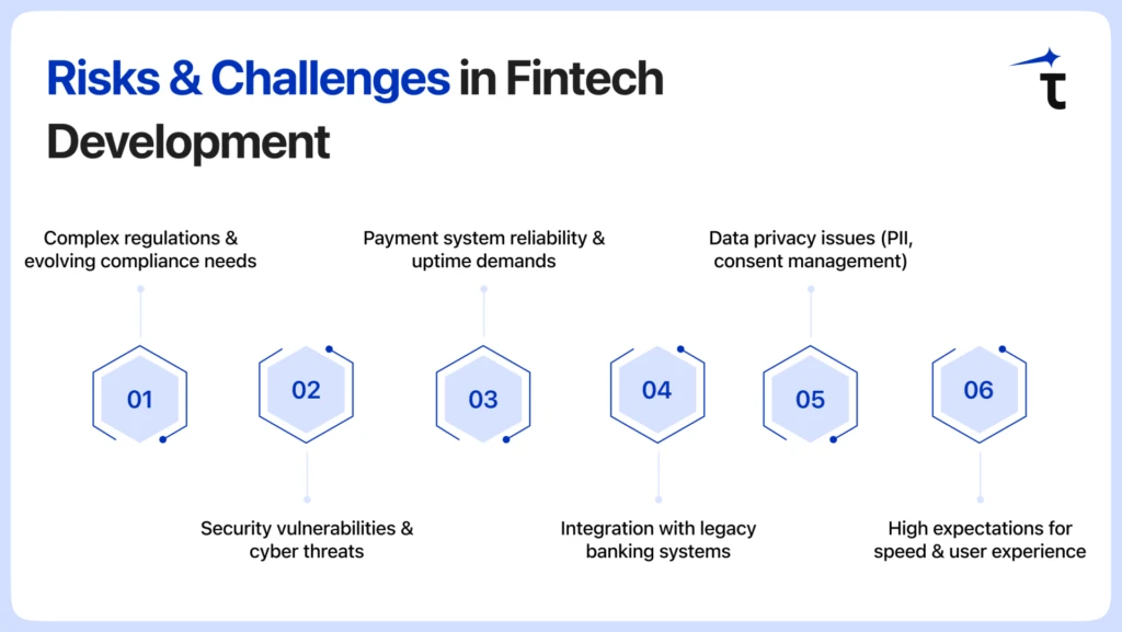 There are complex challenges that are associated with building high-performance fintech software development solutions. With all businesses adopting financial software development for digital transformation, the challenge that they have to overcome is regulatory, technical and security risks and more. Some other ones to note down include: