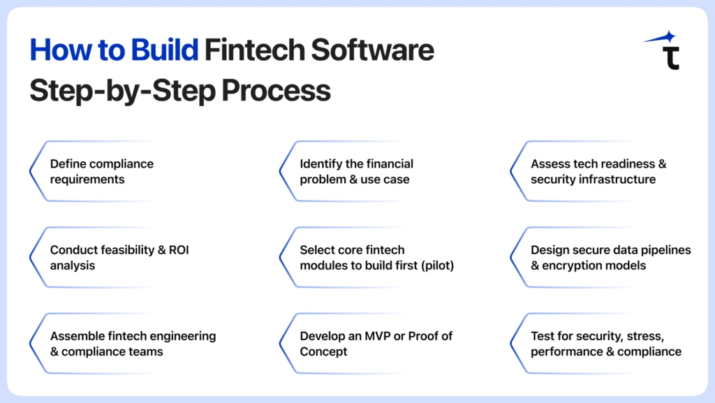 Review your existing systems, data protection functionality, access controls, and encryption standards, and security posture before writing a single line of code. Current fintech software development adheres to a zero-trust philosophy of protecting sensitive financial information.