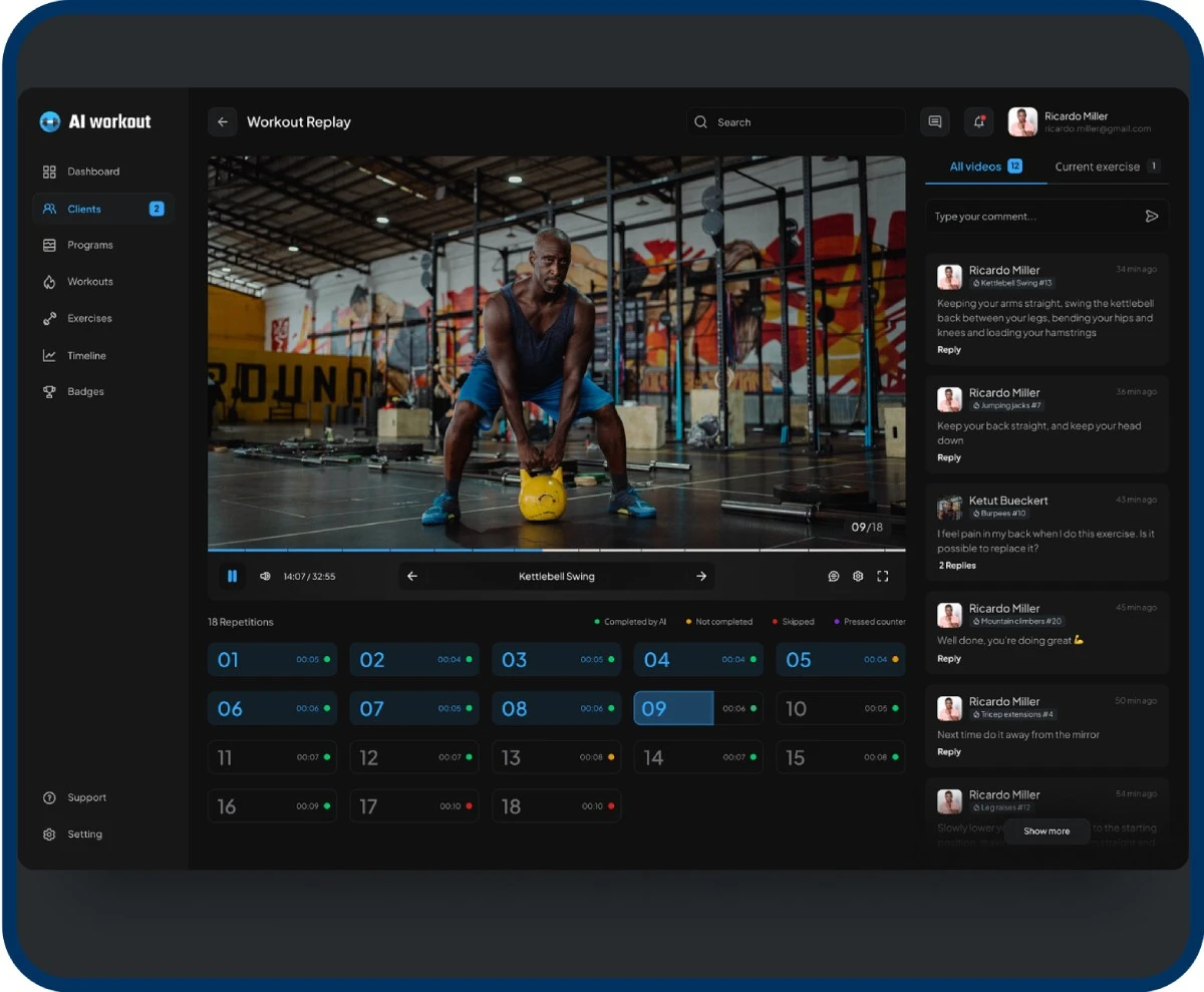 Virtual Coaching and Guidance Our apps provide virtual workouts, online support of a personal trainer, form-correction using artificial intelligence, and video tutorials that are downloaded to the app and can be viewed at any time and location.